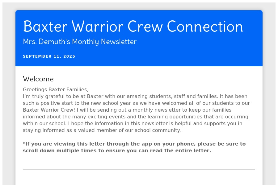 Baxter Warrior Crew Connection Mrs. Demuth's Monthly Newsletter September 11, 2025 Welcome Greetings Baxter Families, Im truly grateful to be at Baxter with our a. . .